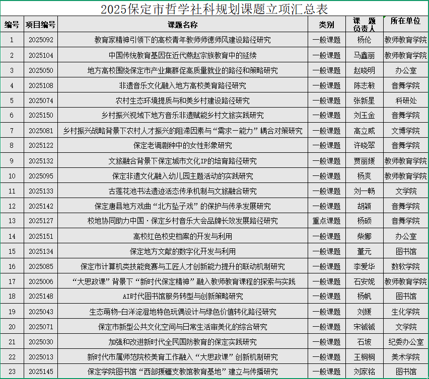 经保定市社科办评审,我校23项课题获2025年保定市哲学社科规划课题立项。