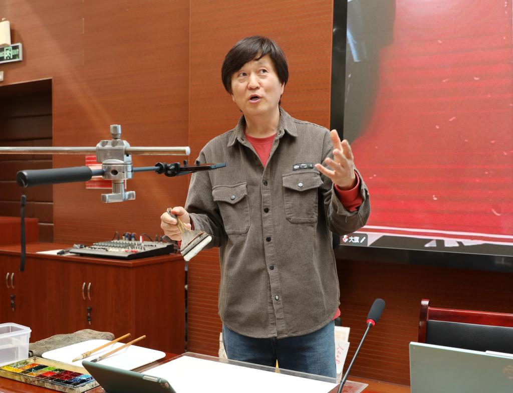 赵记同立足当代水彩画创作现状,以独到视角剖析了传统技法传承与当代艺术创新的融合路径。他通过梳理工具选材、创作技法与艺术表达三个维度,系统解析了水彩画创作从画笔特性、颜料配比、纸张适配等基础要素到水分控制、色彩叠加、构图原则等核心技法,结合数十年创作实践解码水彩画创作精髓,并鼓励创作者发挥长项,捕捉生活中的美好瞬间,将情感融入画作之中。在现场示范环节,他完整展示了水彩风景画的创作过程,从初稿构思、节奏把控、色彩铺陈到细节雕琢一一展现,带领师生们直观感受水彩艺术的独特魅力。